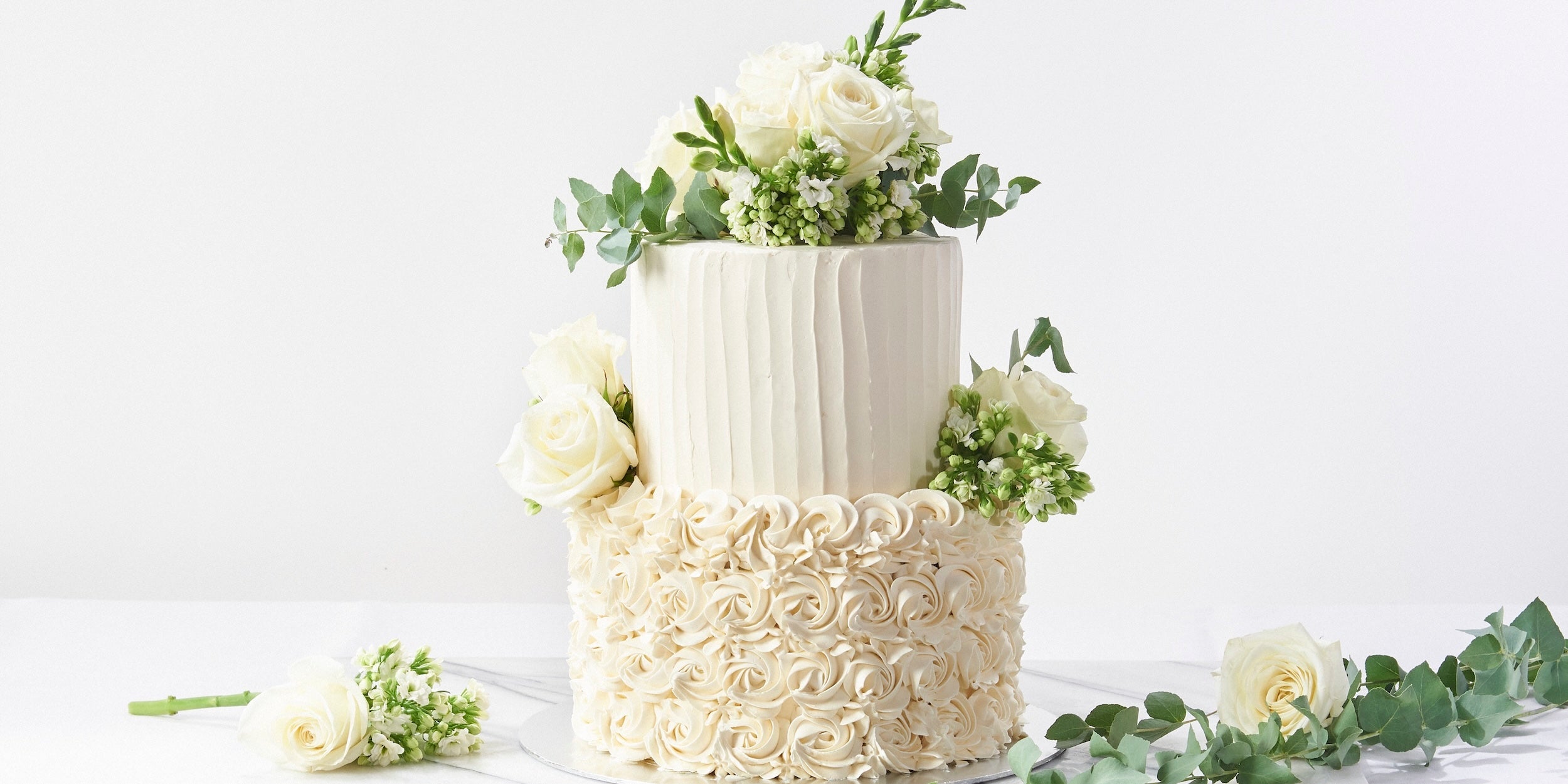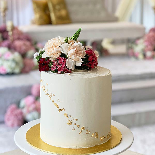 A simple and small, two-tiered wedding cake starts at $388 excluding GST and delivery fees.
