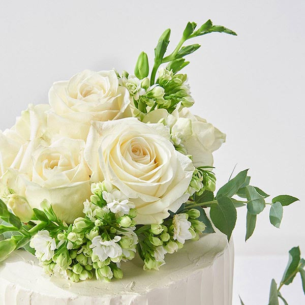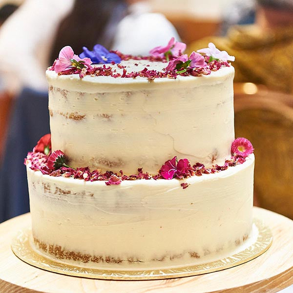 A simple and small, two-tiered wedding cake starts at $388 excluding GST and delivery fees.