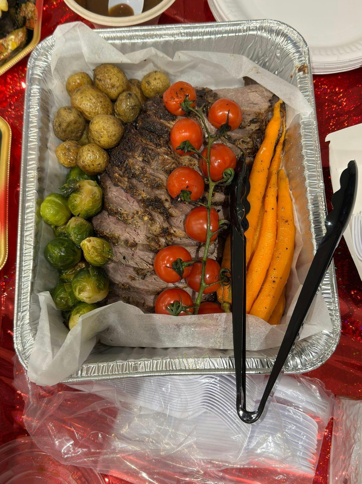 Roast beef was delicious and tender and request to fully slice thd roast beef was followed. The roasted vegs and potatoes were reslly yummy too... well worth it for this price!